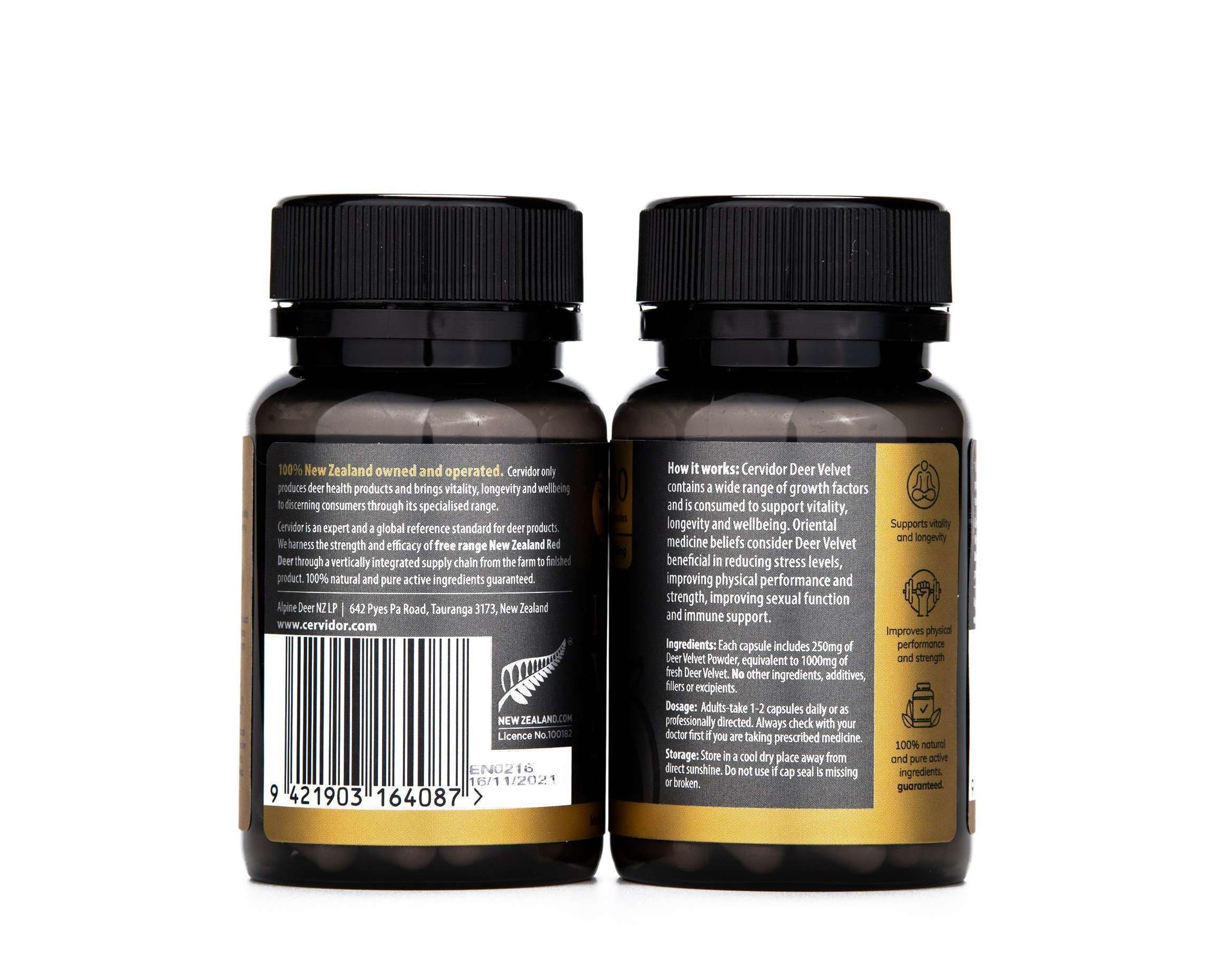Each capsule includes 250mg of Deer Velvet Powder, equivalent to 1000mg of fresh Deer Velvet. No other ingredients, additives, fillers or excipients.